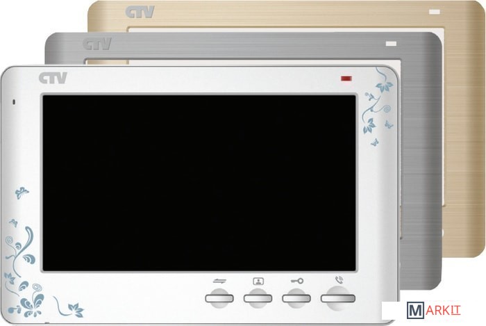 Цветной монитор видеодомофона 7" с детекцией движения. К монитору можно подключить одну или две вызывные панели, одну или две дополнительные внешние камеры, один или два датчика тревоги, дополнительный монитор или телевизор с композитным входом, а также до 3-х дополнительных домофонных мониторов марки CTV.В изделии предусмотрена возможность замены передней декоративной накладки. В комплекте предлагается 3 различных цветовых варианта.